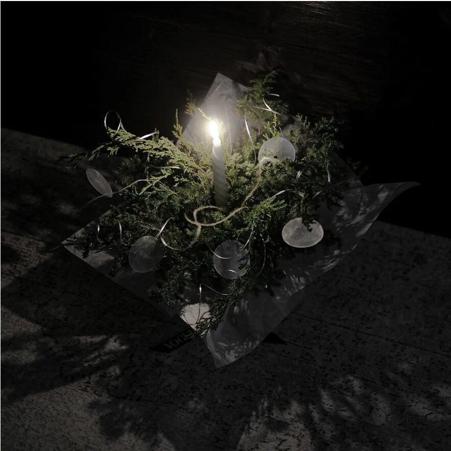 This series is inspired by a tranquil winter forest. The cedar trunk stands tall and resilient, while the cypress branches layer like mist, adorned with misty white ornaments, creating a visual effect reminiscent of a snow-covered landscape. Each bundle is hand-assembled, with branches controlled to 40-50 cm in length. Placed on a table or in the entryway, it instantly adds depth to any space.